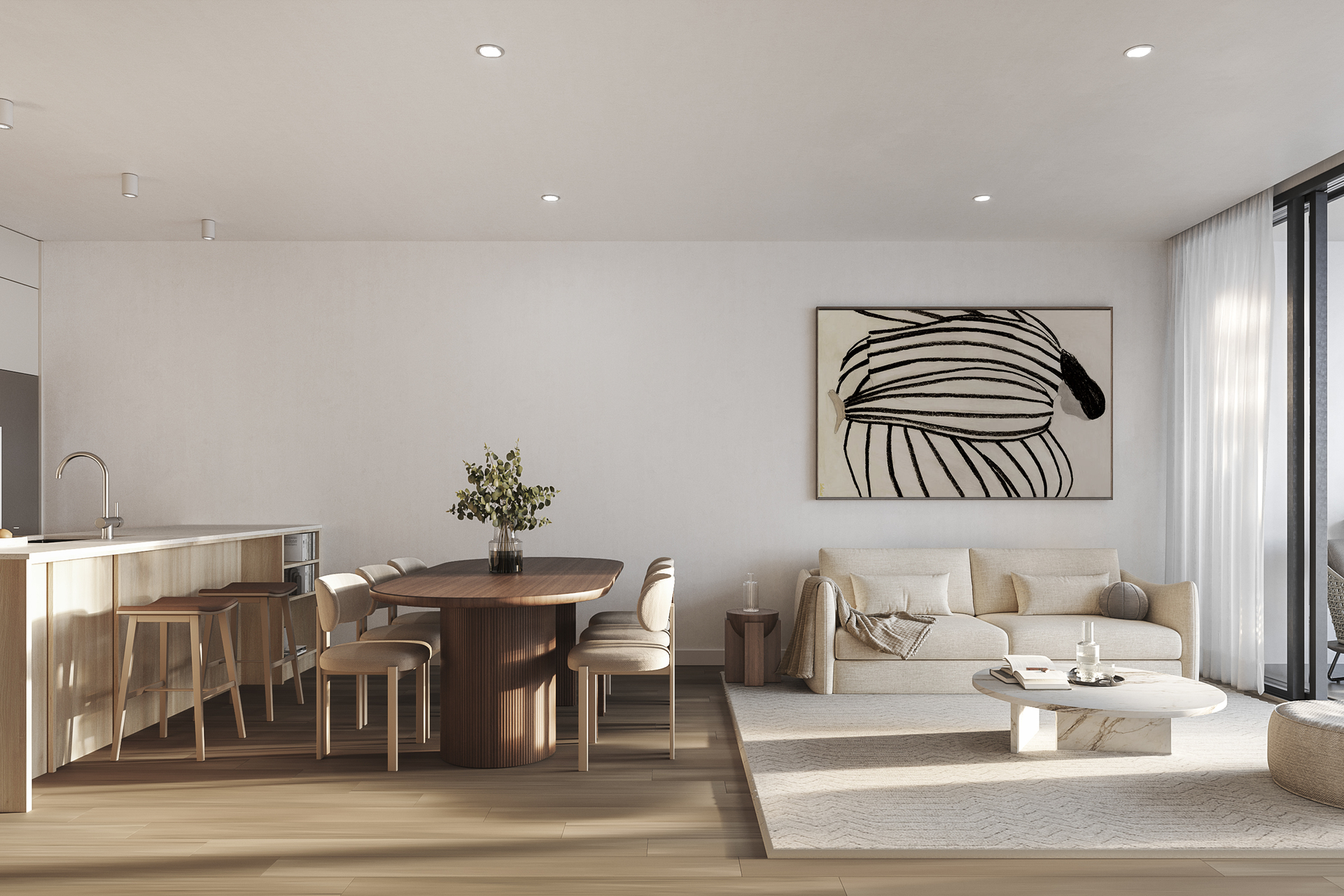 • Generous pantry spaces, designed to provide abundant storage, elevate efficiency, and enhance overall functionality. • Stylish design with premium finishes including hybrid timber flooring in the kitchen and living for an elevated feel, reconstituted stone throughout the kitchen and bathroom, recessed down light fittings to living/dining areas.