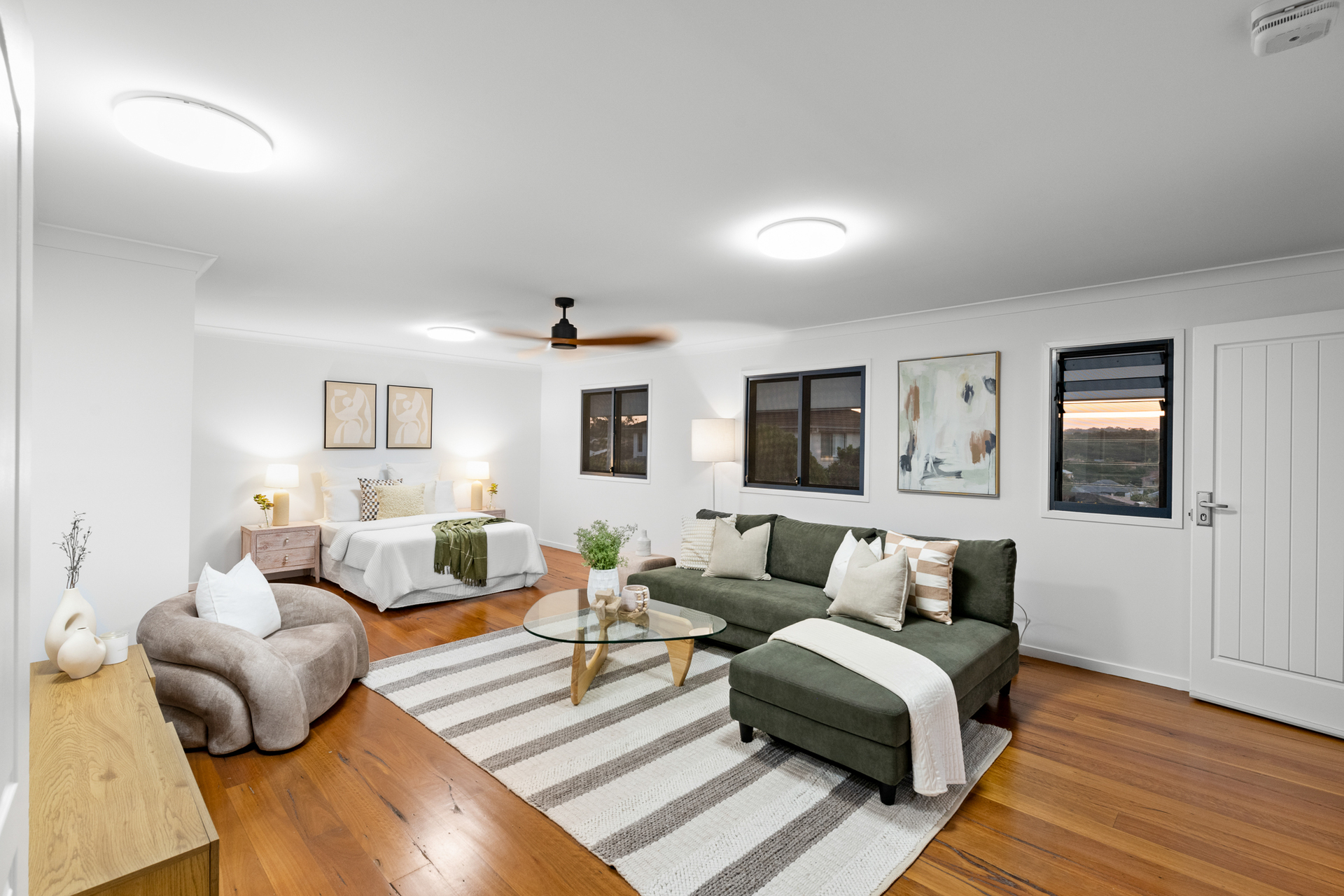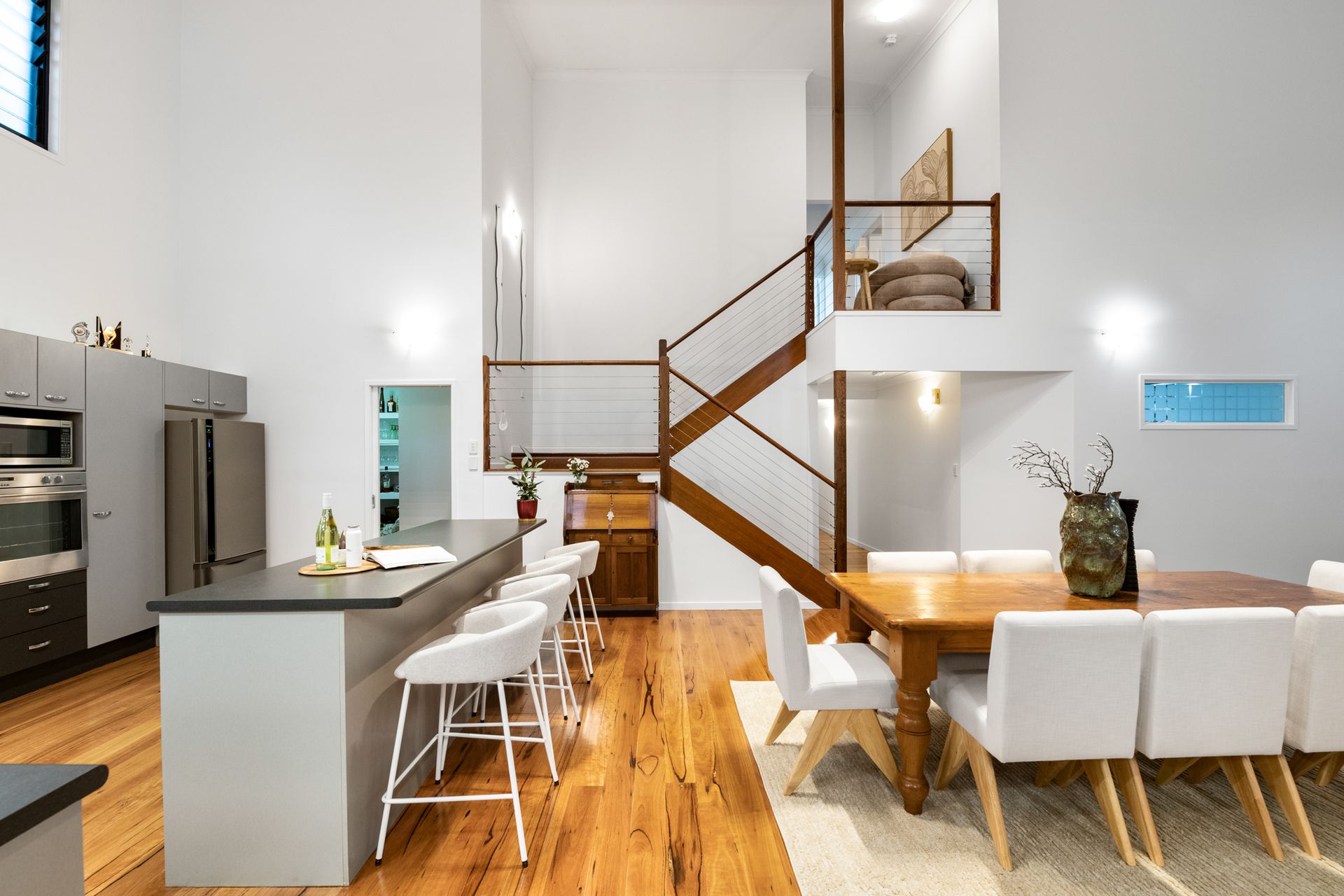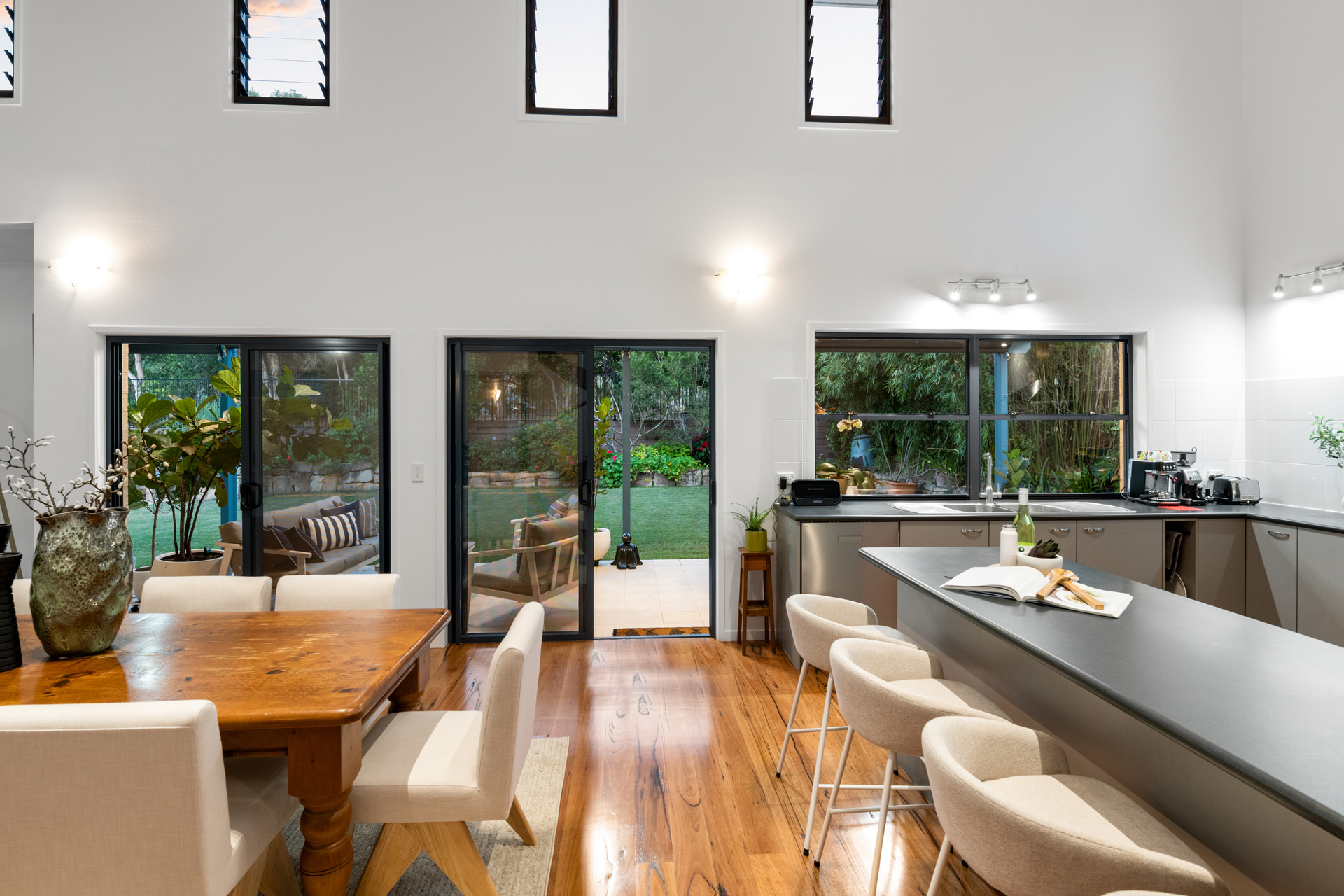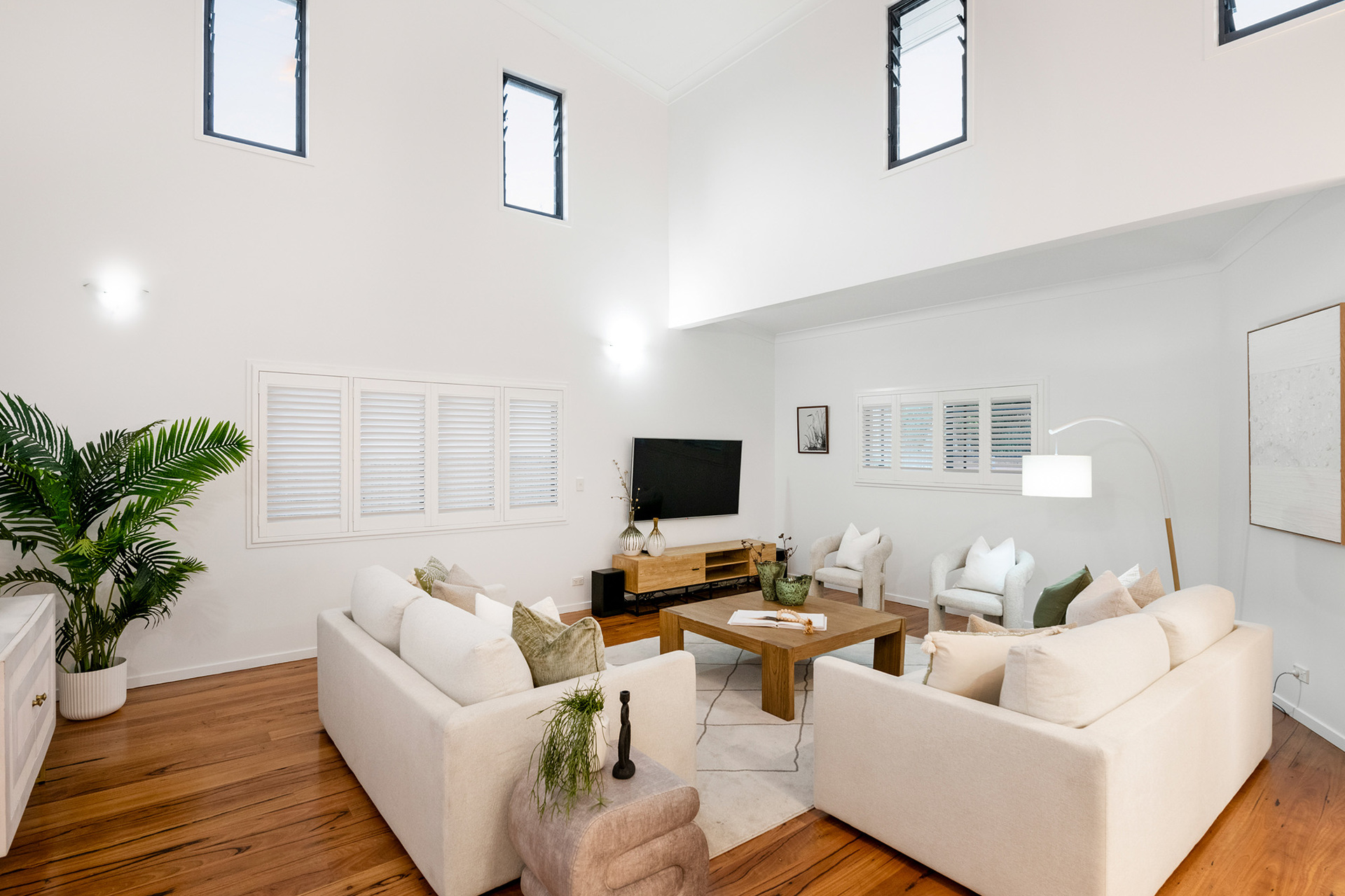 Blackbutt timber flooring and plantation shutters adorn the stylish interiors, and the free-flowing lounge, dining area and culinary kitchen rest below soaring 6-metre ceilings on the ground floor. With louvres and glass sliders strategically positioned to create a light-filled and lofty atmosphere across the expansive layout, families are offered blissful space to stretch out, unwind and come together.