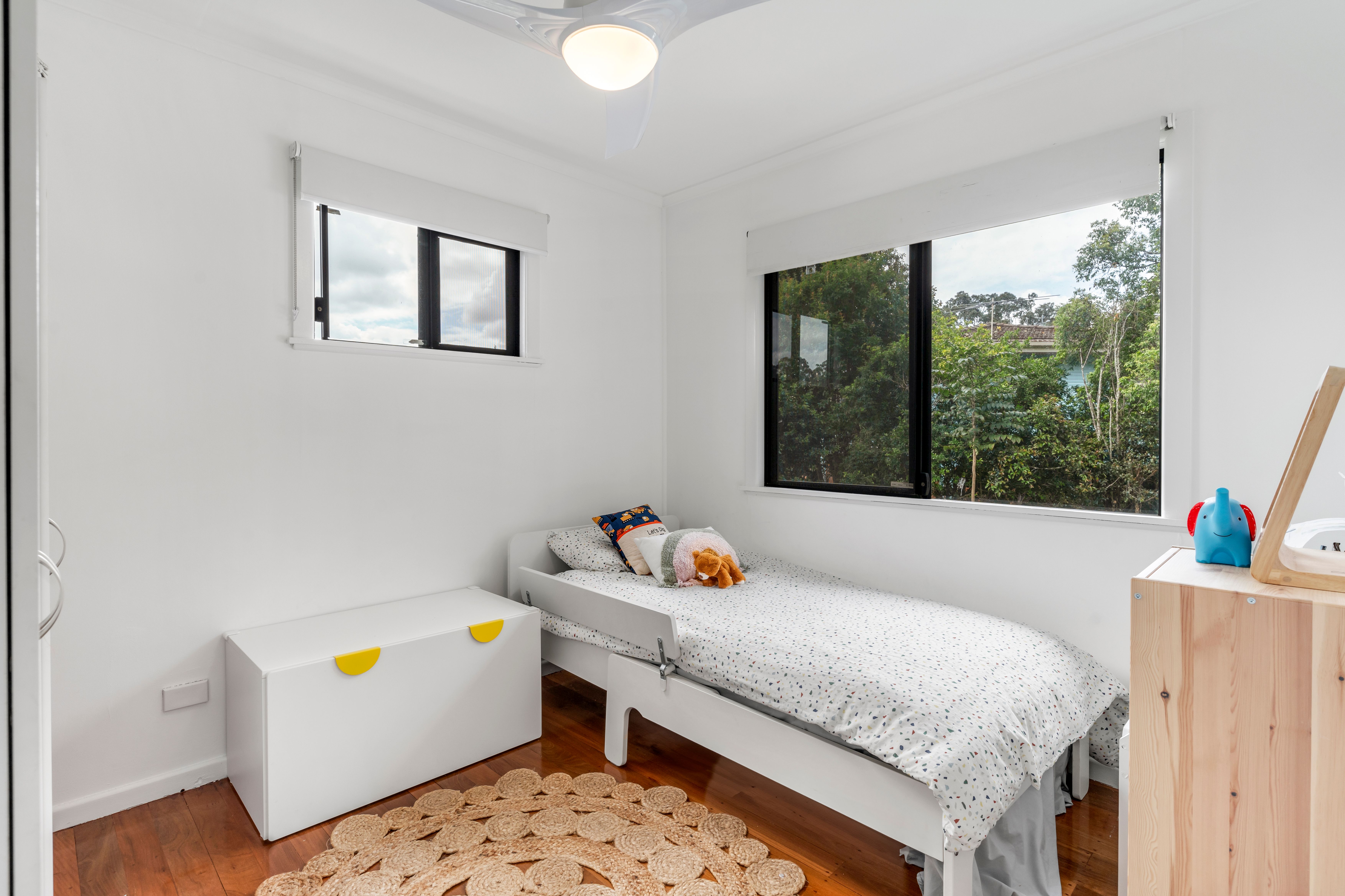 The residence offers three spacious bedrooms, each with neutral-tone carpeting, high ceilings, and abundant natural light. The master bedroom is a peaceful sanctuary with direct balcony access and air conditioning, while a conveniently located central family bathroom serves the other bedrooms. A second bathroom on the lower level adds extra convenience for busy families.