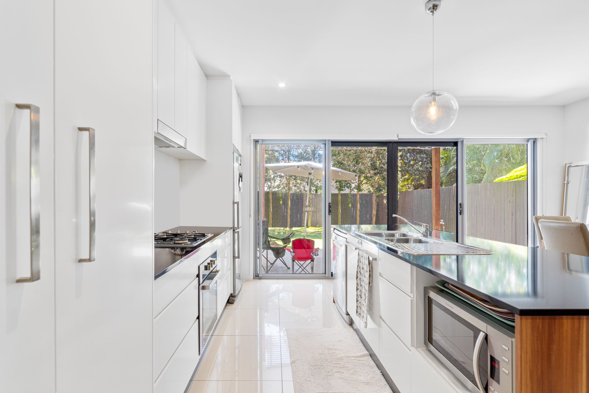 This area flows seamlessly to the dining space and functional and contemporary look kitchen that features a timber island with stone bench and a range of high-quality cabinetry including stainless steel oven, gas cooker and dishwasher.
