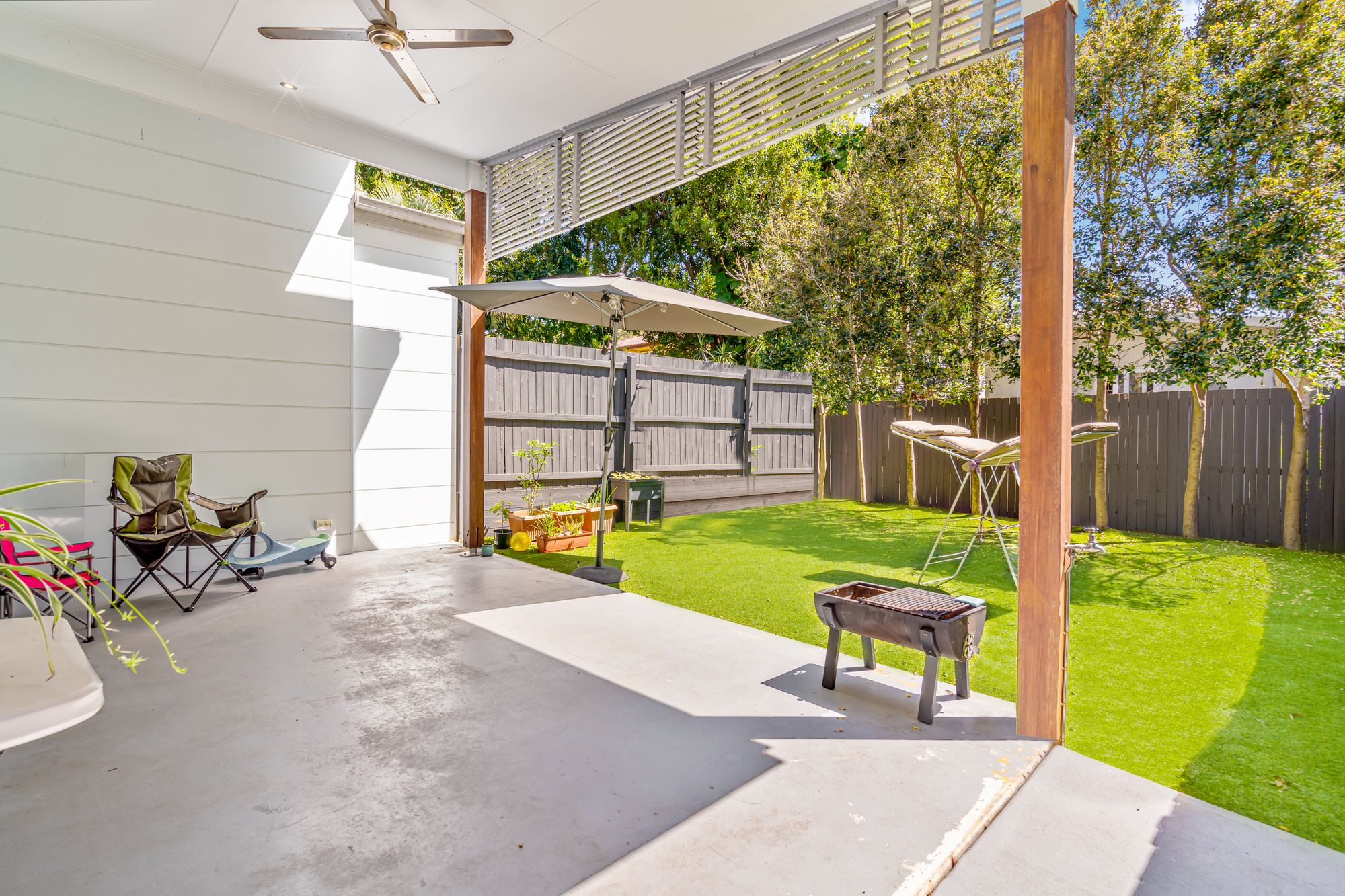 The large double sliding doors open to the cool and shaded courtyard garden which has a wide and covered patio area suited for table setting and BBQ set up. This extends onto the low maintenance garden which is fenced and has mature trees backing to the border creating dappled light and shade.